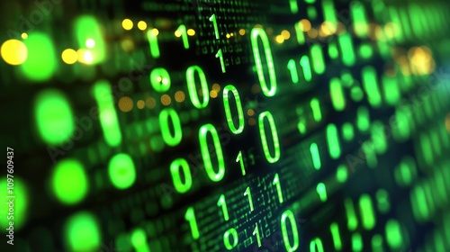 Visual representation of futuristic 3D binary code on a digital screen, with glowing green digits and a tech-inspired environment.