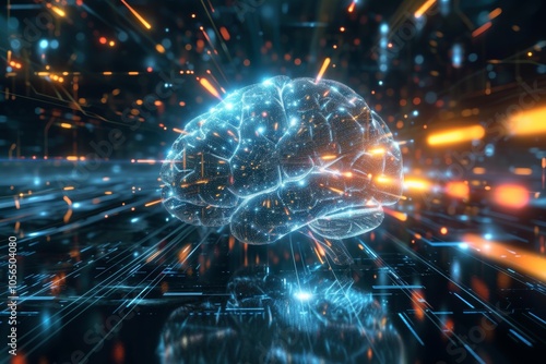 Visual representation of the digital brain concept showcasing artificial intelligence with vibrant lights and data streams in a futuristic setting