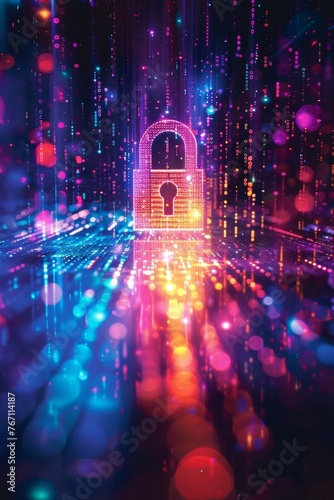 Visualizing cyber defense as a secure encryption system processing digital data transmissions, encapsulated by a range of bright and varied hues.
