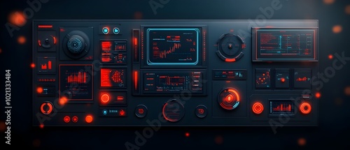 Visually striking futuristic control room featuring complex data analytics displays state of the art GUI control panels with holographic interfaces vibrant color scheme with pulsing neon accents