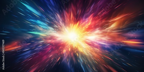 Vivid burst of colorful cosmic energy, abstract space explosion. Starburst effect with dynamic rainbow hues, suitable for backgrounds and designs.