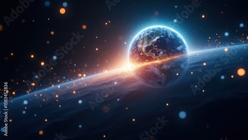 Vivid depiction of earth in space, surrounded by glittering particles.