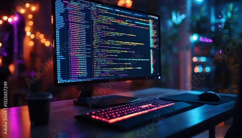 Vivid programming code on a monitor, closeup, blurred background, generative AI technology, neoncolored lines of code, hightech digital innovation atmosphere