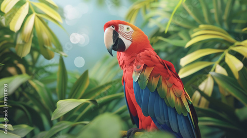 Vivid red macaw parrot perched in lush green tropical foliage, looking aside.