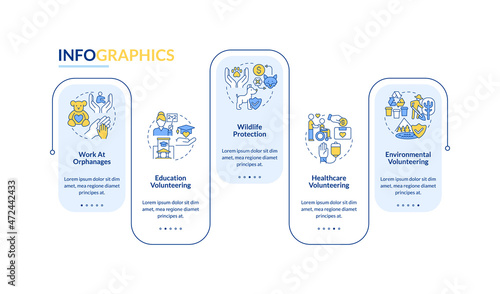 Volunteering work type vector infographic template. Charity presentation outline design elements. Data visualization with 5 steps. Process timeline info chart. Workflow layout with line icons