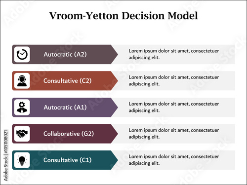 Vroom-Yetton Decision Model - Autocratic(A2), Consultative(C2), Autocratic(A1), Collaborative(G2), Consultive(C1). Infographic template with icons and description placeholder