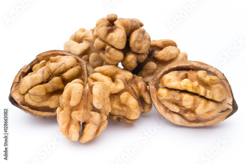 Walnut and walnut kernel isolated on the white background.