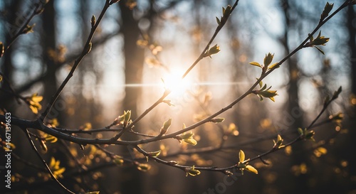 Warm sunlight illuminates budding branches spring awakening. AI Generated