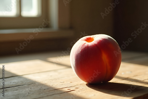 Warm Sunlit Peach with Delicate Fuzz on Rustic Wood Table