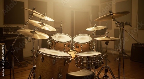 Warmly Lit Drum Kit Ready for a Studio Session, Evoking Musical Creativity.