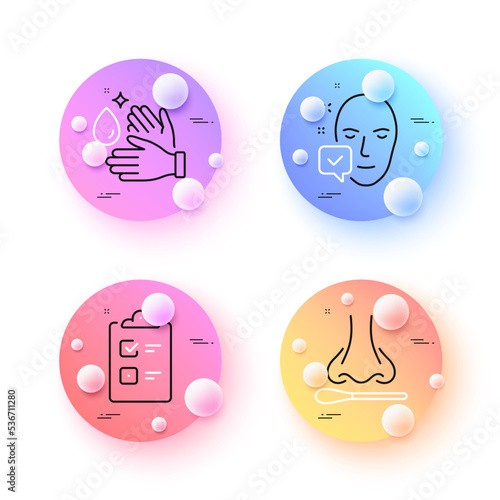 Wash hands, Nasal test and Face accepted minimal line icons. 3d spheres or balls buttons. Checklist icons. For web, application, printing. Clean arms, Covid testing, Access granted. Vector