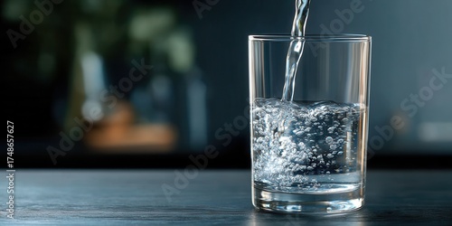 Water Being Poured Into a Clear Glass on a Dark Background Near a Bright Setting