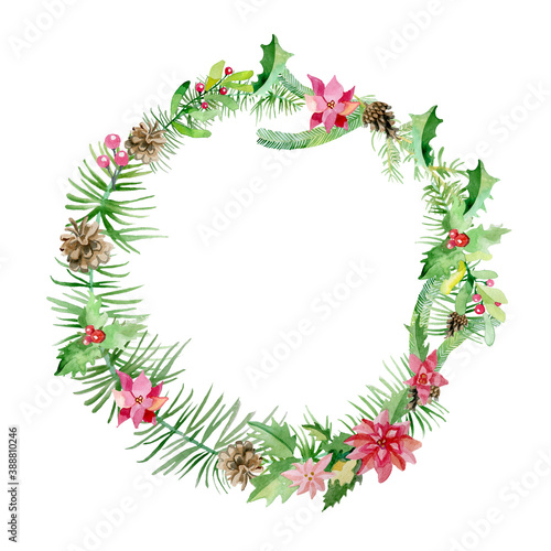 Watercolor colorful greeting decoration Christmas wreath with holly berries. Happy New Year card