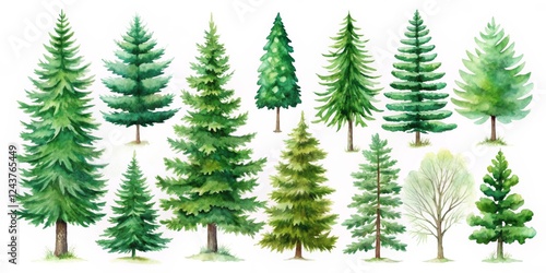 Watercolor Evergreen Collection Diverse Conifer and Deciduous Trees