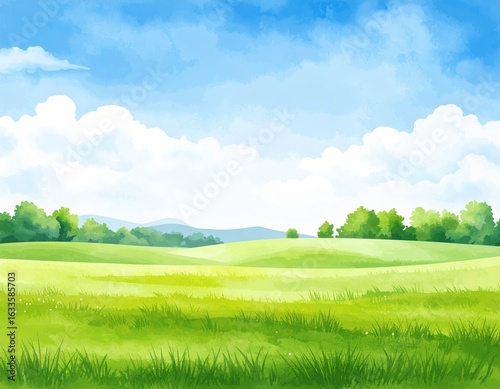 Watercolor Meadow Landscape Rolling Green Hills Under a Blue Sky with Clouds.