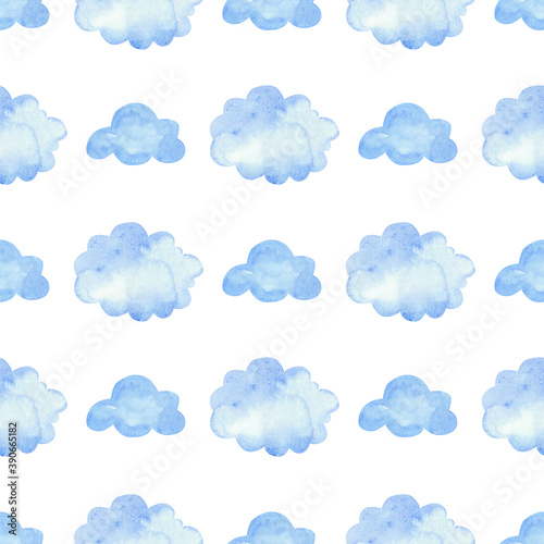 Watercolor pattern with blue clouds. Seamless background elements on white.