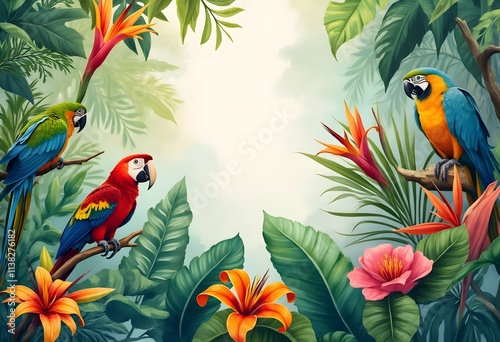 Watercolor Rainforest Scene with Exotic Flowers and Parrots