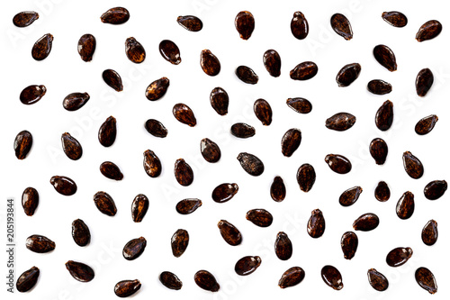 Watermelon seeds isolated on white background. Flat lay. Black seed Pattern. Food concept..