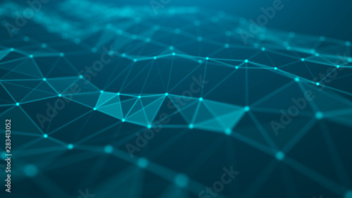 Wave of particles. Abstract blue technology background. Science background. Big data. Background . Plexus effect. Network connection structure. 3d rendering.