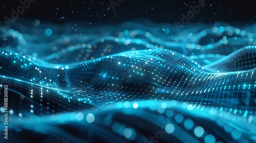 Waves on an abstract blue tech background with a dynamic network. Generative stock.