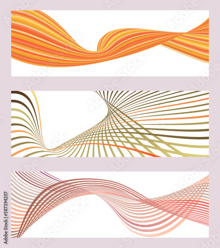 Wavy lines or ribbons. Set of 3 backgrounds. Multicolored striped gradient. Creative unusual background with abstract gradient wave lines to create a trendy banner, poster. vector eps