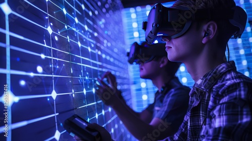 Wearing virtual reality simulators, engineers collaborate on designing and optimizing solar panels. This depiction emphasizes