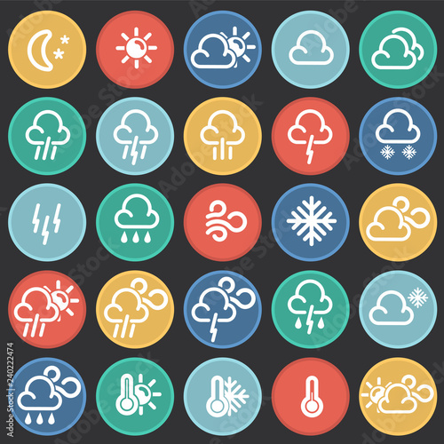 Weather forecast icons set on color circles black background for graphic and web design, Modern simple vector sign. Internet concept. Trendy symbol for website design web button or mobile app