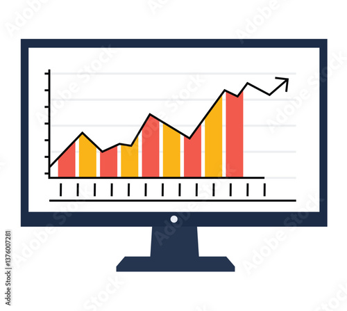 Web analytic information on Computer screen flat icon. trend graphs report concept. statistic charts for planning and accounting, analysis, audit.