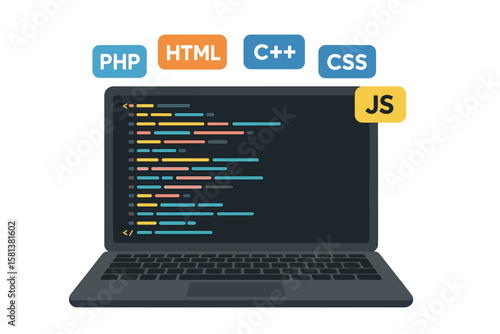 Web and software development vector. Laptop screen with colorful code and programming language icons: PHP, HTML, C++, CSS, JS. Programmer coding technology illustration.