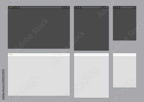 Web browser window light and dark template. Sample frame design Internet page mockup. Blank screen web browser in flat design. Vector illustration