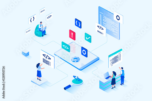 Web development 3d isometric design. People designers create and optimize code, programming at java script, settings pages, build site layouts and places navigation buttons. Web illustration