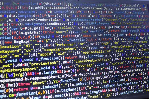 Web development javascript HTML5 code. Abstract information technology modern background. Network hacking. Lines of minificated JS code. Screen of web developer.