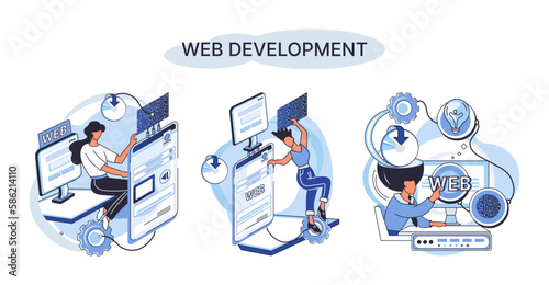 Web development metaphor, coding and programming responsive layout internet site or app of devices. Creation digital Software mobile, desktop platforms. Computer code, tablet, phone, digital business