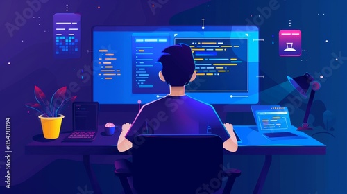 Web development. programming languages. css, html, it, ui. programmer cartoon character developing website, coding. flat illustration banner