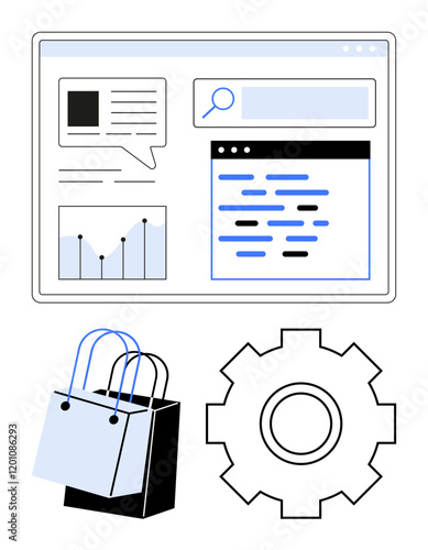 Web interface with search bar, analytics graph, code snippets, shopping bags, and gear icon. Ideal for online shopping, analytics, coding, marketing system optimization technology abstract line