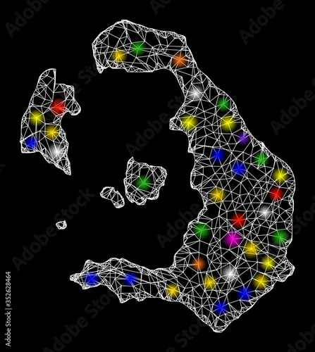 Web mesh vector map of Santorini Island with glare effect on a black background. Abstract lines, light spots and dots form map of Santorini Island constellation.