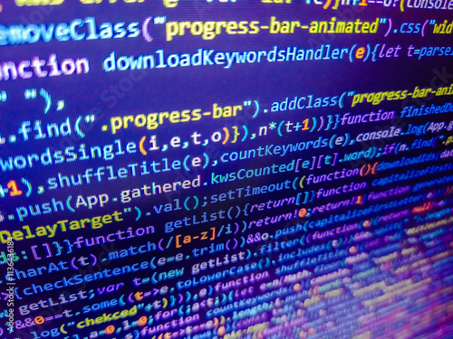 Website codes on monitor. Virus in program code. Black background space with multiple layers coding. Php web programming source code. Abstract modern virtual computer script. Coding concept.