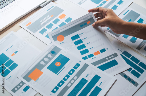 Website designer Creative planning application developer development draft sketch drawing template layout prototype framework wireframe design studio . User experience concept .