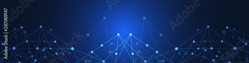 Website header or banner design with abstract geometric background and connecting dots and lines. Global network connection. Digital technology with plexus background and space for your text.