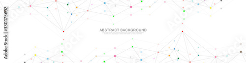 Website header or banner design with abstract geometric background and connecting dots and lines. Global network connection. Digital technology with plexus background and space for your text.