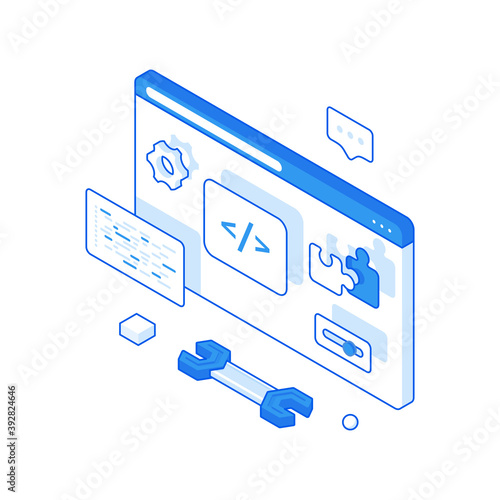 Website programming and debugging isometric illustration. Writing coded software with further testing.