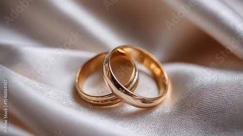 Wedding rings on white silk fabric, soft light, close-up shot, romantic theme