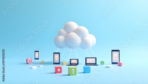 Whimsical Cloud Platform, A Futuristic Minimalist Illustration with Connected Devices and Playful Elements on a Soft Blue Background Depicting Connectivity