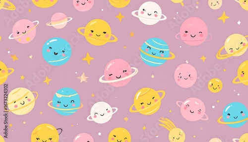 Whimsical planetary pattern showcasing adorable cartoon planets on a violet background