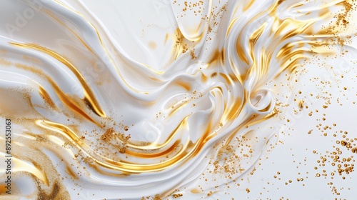 White and gold abstract background with liquid paint waves and splashes.