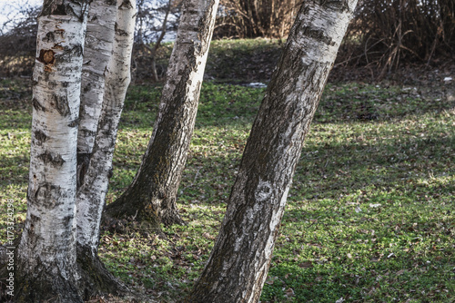 White birch trunks close-up, selective focus. Background with trees.