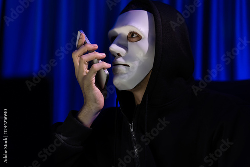 White criminal anonymous mask calling to IT owner to threaten ransom with big database, installing coding password encryption by programming hack, trying to make insecure thorough privacy. Pecuniary.