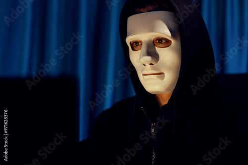 White criminal anonymous mask installing coding password encryption by programming hack, trying to make insecure thorough privacy taking massive database on computer for ransom to company. Pecuniary.
