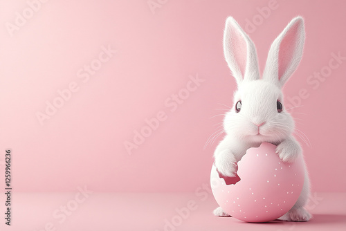 White cute easter bunny peeking out of broken pink easter egg on pink background. Minimal easter composition