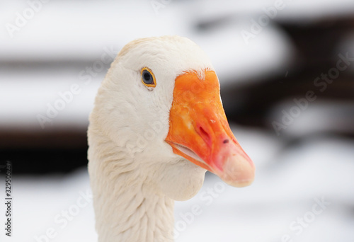 White goose in the village. Winter